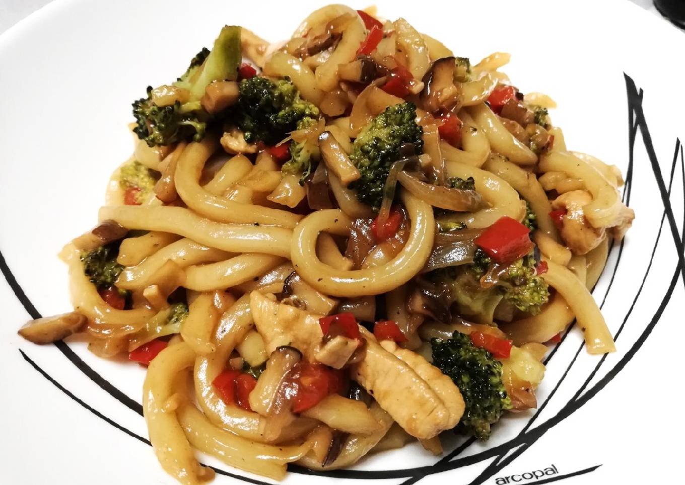 Fideos udon con verduras, setas y pollo