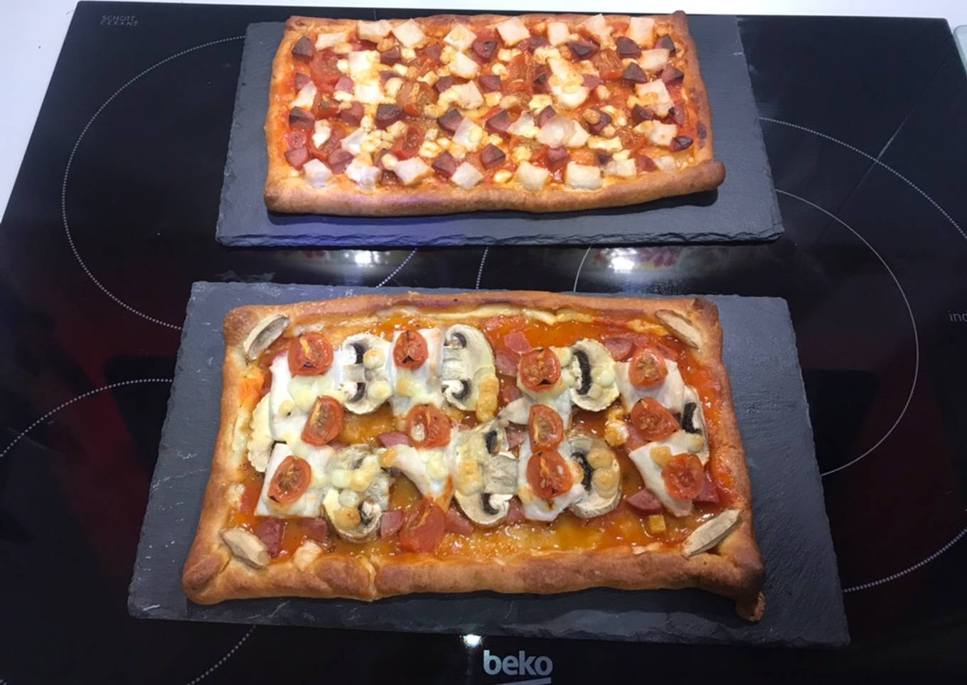 - Precalentamos el horno a 250º 5 minutos mínimo arriba y abajo. Luego los bajamos a 200º e introducimos las pizzas durante 23 minutos a mitad del horno.