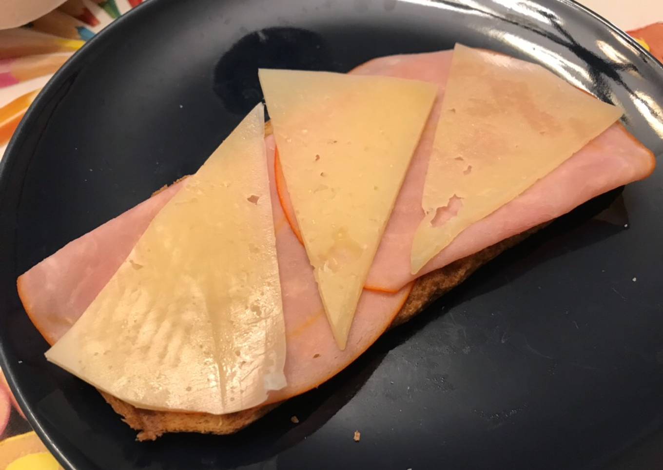 - Tostamos el pan, untamos con un poco de aceite de oliva, añadimos dos rodajas de pechuga de pollo braseadas y unas rodajas finas de queso curado por encima