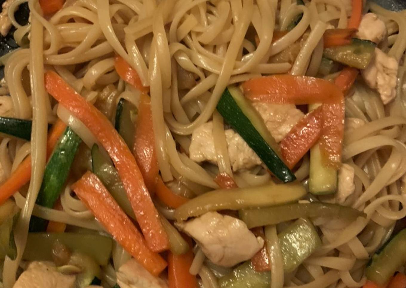 Tallarines con verduras y pollo con salsa de soja, estilo chino. Para dos personas