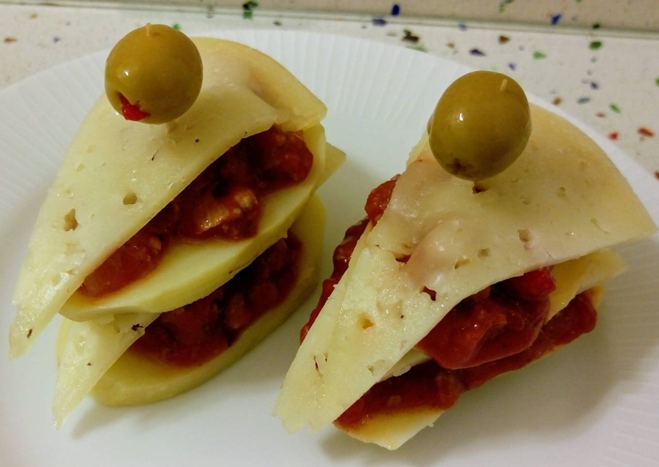 - En una bandeja colocamos primero una rodaja de patata, echamos un poco encima de carne con tomate y la loncha de queso y volvemos otra vez a colocar lo mismo y sujetamos con un palillo para que no se caiga y nos saldrán 4 pinchos, metemos 30 segundos en el microondas para que se derrita un poco el queso y por último pinchamos una aceituna en el palillo.