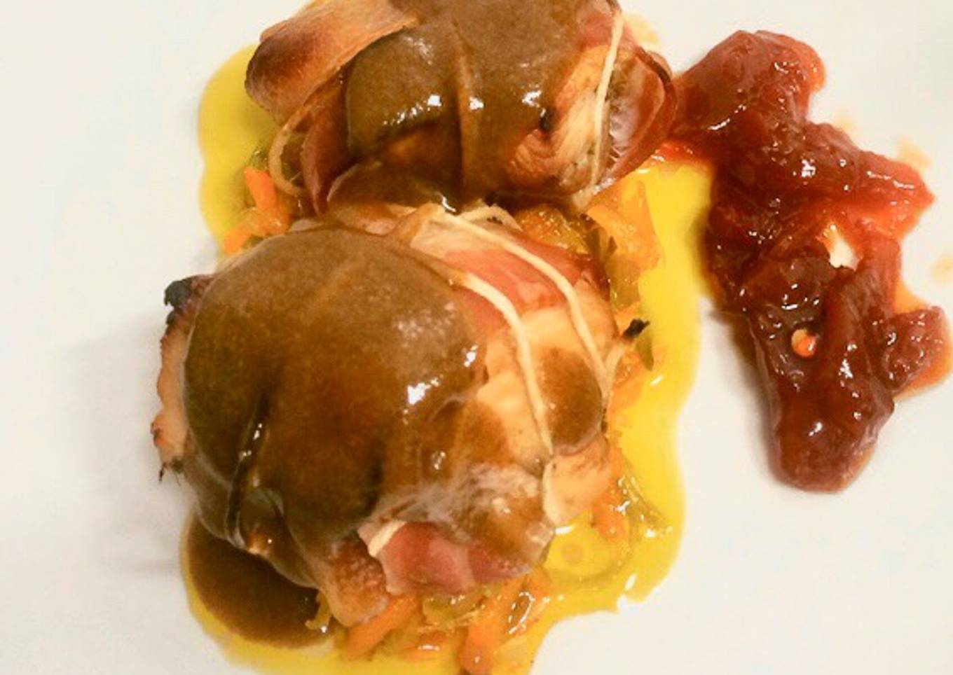- Mientras hacemos nuestros paquetes que no son más que un taco de pechuga enrollada en una loncha de bacon (para que le aporte jugosidad) y la bridamos para que no se nos suelte. Una vez hechos los metemos en una fuente de horno y los pincelamos con la manteca de cerdo fundida. Lo ponemos al horno precalentado a 200º durante unos 30 minutos