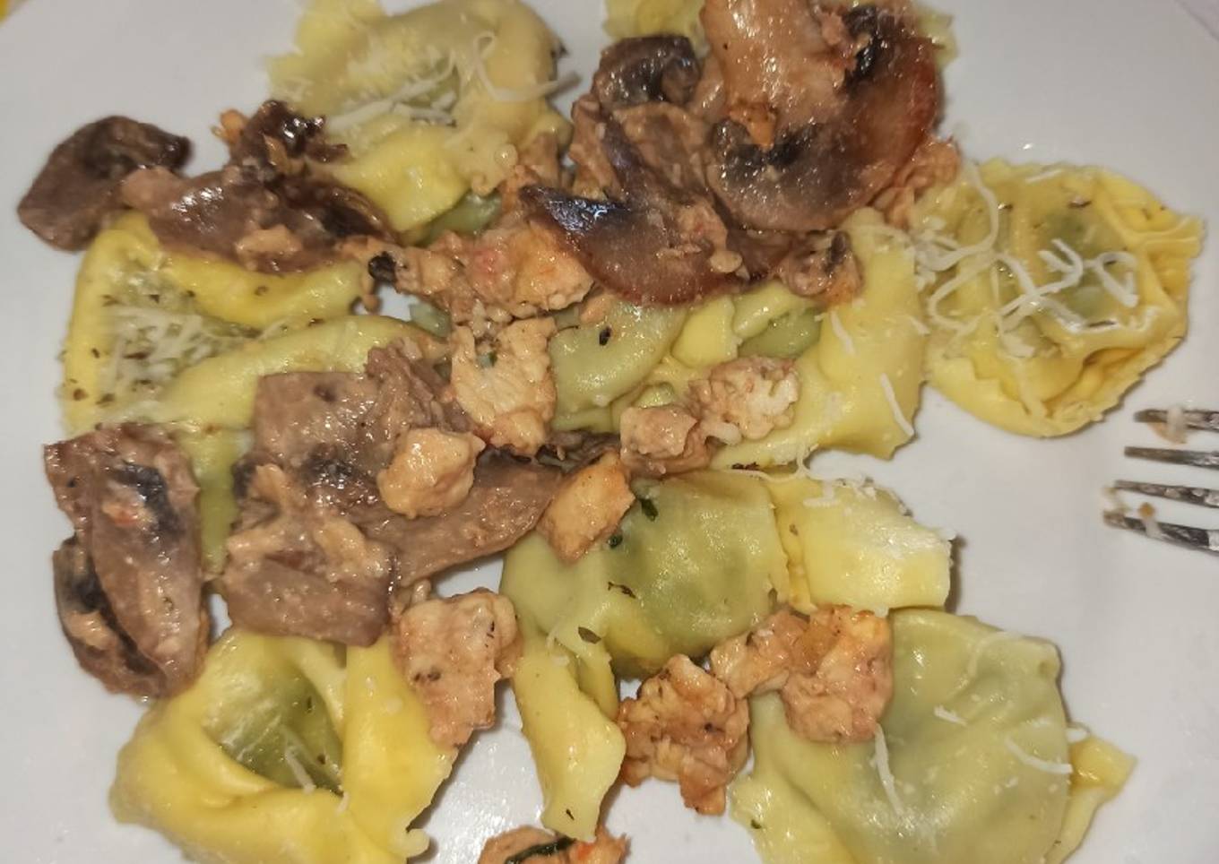 Pasta rellena de ricota y espinacas con pollo y champiñones