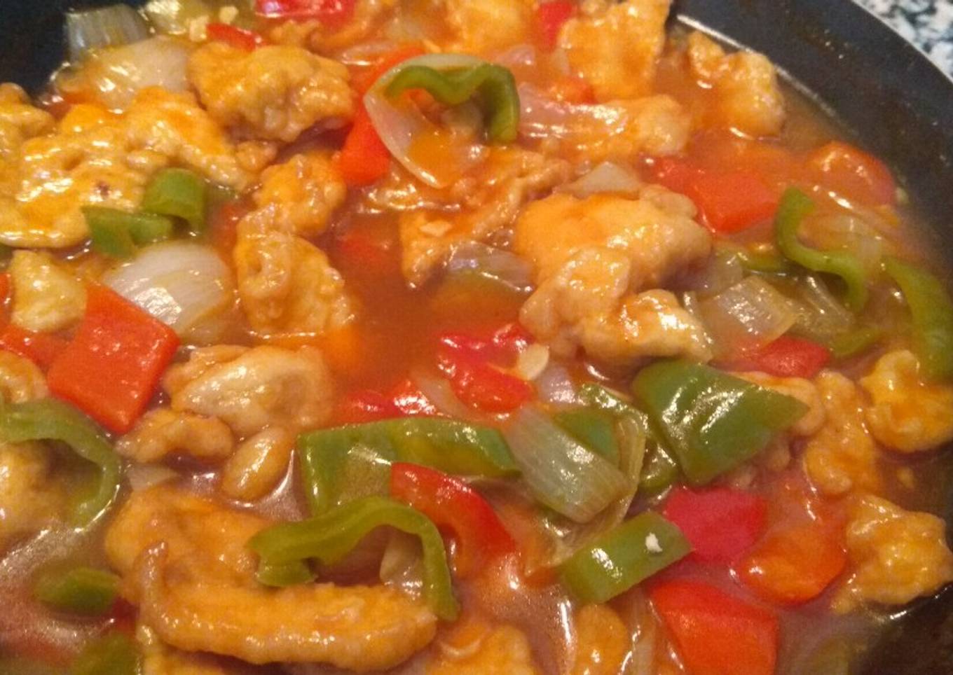 - En una sartén añadimos una cucharada de aceite, añadimos el ajo picado y seguidamente la cebolla y los pimientos más una pizca de sal. Hay que dejar la verdura que esté al dente. Removemos con el fuego alto un minuto y añadimos la salsa agridulce.